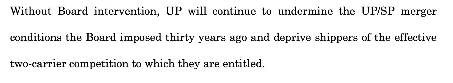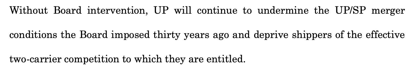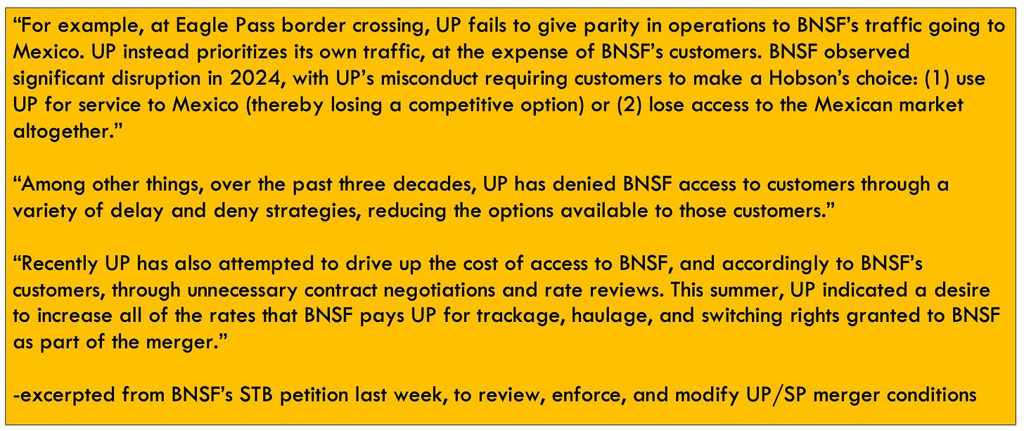 · BNSF, ahem, has a less charitable view of the merger’s impact, and the conditions the STB imposed. “In the nearly thirty years since the UP/SP merger… UP has engaged in a pattern of obstructive conduct that has diminished those competitive options and has harmed customers by delaying or preventing BNSF from fully replacing the competition that was lost through the UP/SP merger as the Board originally intended.” In fact, BN is now asking the STB to “review the conditions imposed in connection with he UP/SP merger, enforce the obligations UP has refused to abide by, and modify those conditions as necessary to preserve the competition the Board envisioned.”