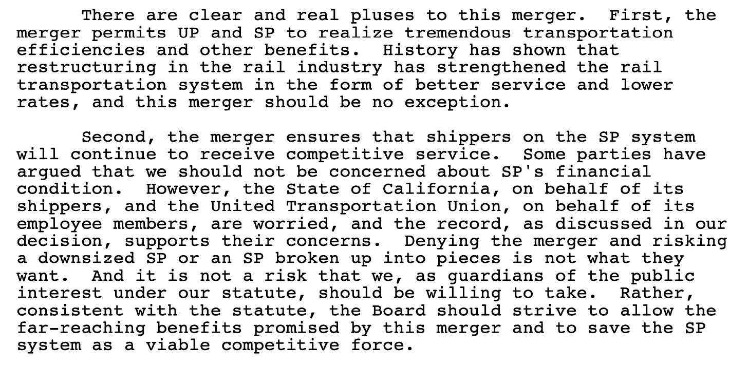 · Vice Chair J.J. Simmons, an ICC member when it voted to reject the Southern Pacific-Sante Fe merger, explained why the Union Pacific-Southern Pacific merger was different. For one, UP’s negotiated remedies with BNSF and various shipping groups provided meaningful mitigation to competitive harms. In addition, economic conditions had changed—he cited the rapid growth of intermodal shipping, which stood to benefit most from the UP-SP merger. He agreed with Morgan about trackage rights being a better solution than divestitures. He invoked SP’s weak finances as well, which—among other things—made it an “unreliable provider of rail service to the [Defense Department].” SP’s weak state also put its workforce at risk of losing their jobs.