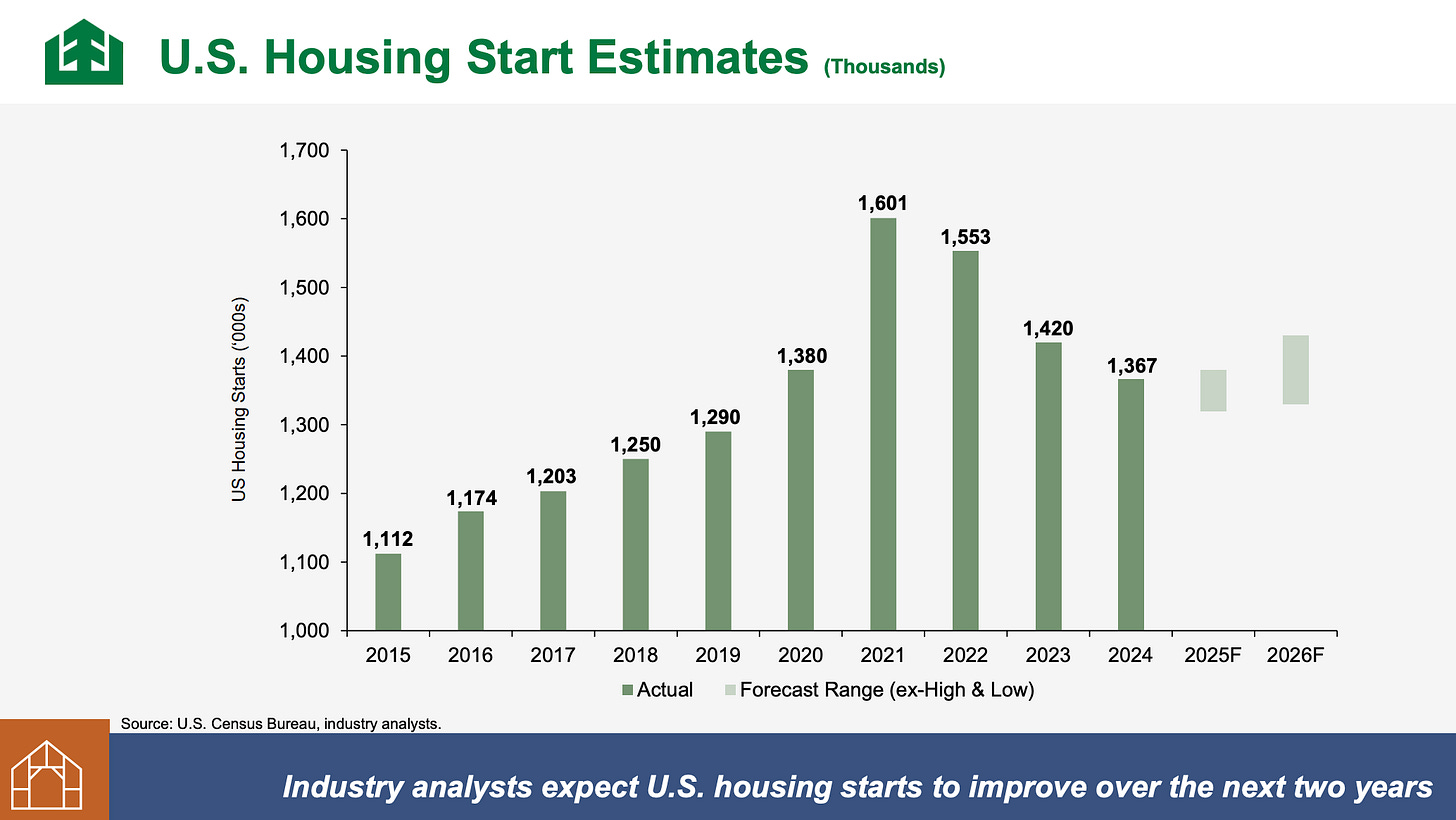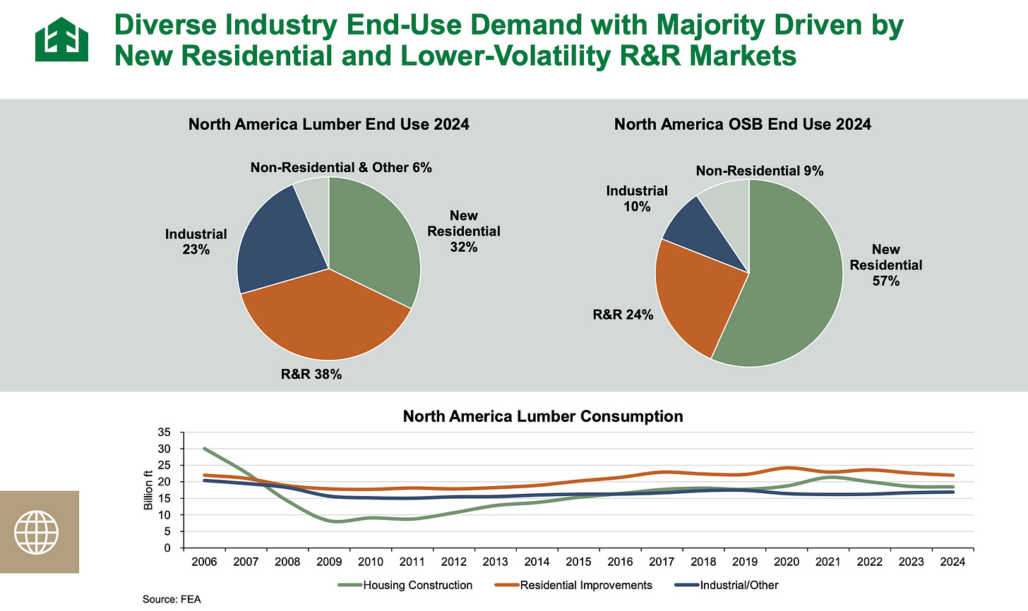 · You can see from the chart above how different freight categories have trended over the past two years. Lumber shipments, most strikingly, are way down in response to a 45% U.S. tariff. Lumber centerbeams, used for homebuilding, have fallen sharply in price, to what Houle said were below breakeven levels for Canadian producers. CN moves more lumber in North America than any other railroad. Note below some trends in the housing-sensitive lumber business (R&R refers to the repair and remodeling market).