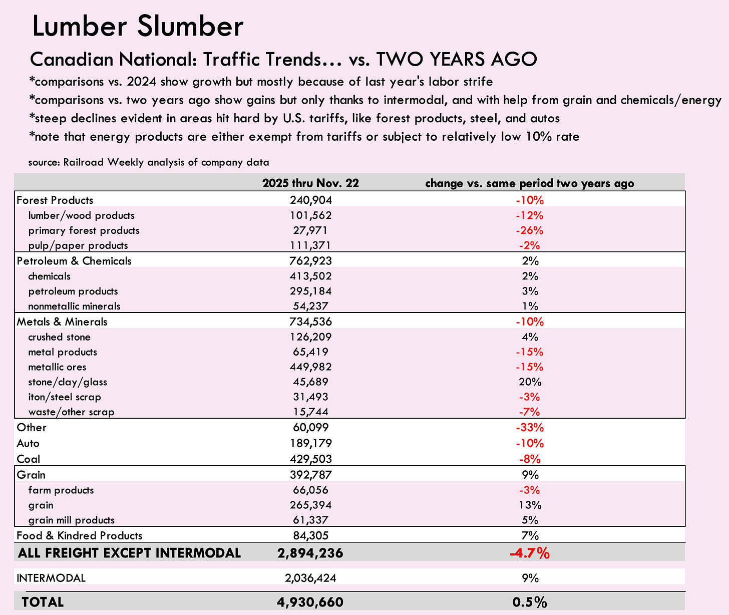 · But how is traffic looking this year versus two years ago? Not so great. Things superficially look fine so far this year, thanks to strong intermodal growth. Container traffic is up 9% through the first 47 weeks of the year, compared to the same 47 weeks of 2023. But excluding intermodal, CN’s carload volumes so far this year are down 5% from two years ago.
