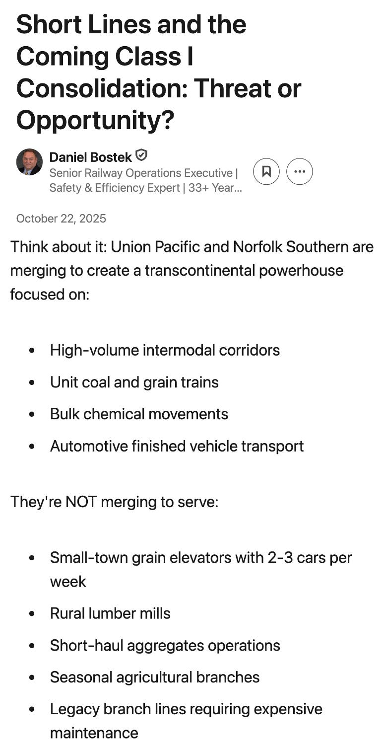 · Rail consultant Daniel Bostek, in a LinkedIn post, discusses what a UP-NS merger could mean for shortline railroads. The merger could, he writes, present “massive” opportunities for “consolidators” eager to expand their railroad portfolios. As Bostek explains, “the Surface Transportation Board doesn’t just approve or deny deals—it forces competitive concessions.” In other words, the STB could force UP to divest portions of its network. Some of the larger North American shortline operators today include Genesee & Wyoming, Watco, OmniTRAX, RJ Corman, and Patriot Rail. “These are not your grandfather’s short lines. They’re sophisticated logistics companies with deep-pocketed institutional owners who see the UP-NS merger as a once-in-a-generation acquisition opportunity.” UP, Bostek reasons, might itself offer to shed lower-density branch lines that don’t mesh well with the PSR business model. And this could be a “gold mine” for shortline acquirers. Opportunities could include “branch lines serving agricultural, forest products, aggregates, and small industrial customers that Class I carriers consider ‘non-core.’”