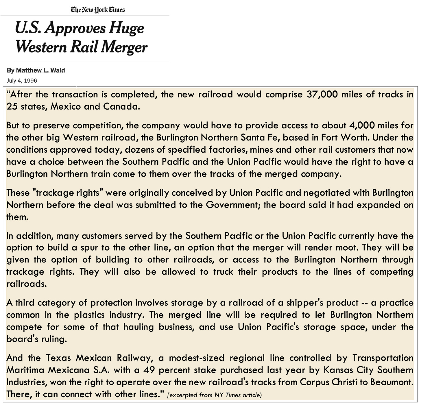 · The UP-NS merger application could come as early as this week, based on UP’s stated intention to submit it in early December. As the industry waits, let’s go back 30 years, to look at the outcome of UP’s last big merger, with Southern Pacific. On August 6th, 1996, the Surface Transportation Board (STB) issued its decision to approve the UP-SP merger, following roughly one year of review—UP filed its application in November 1995. At the time, the two railroads said their combination would enable new routes for shippers—Oakland to Chicago, for example, and Los Angeles and Chicago. They’d have a fast path from the west coast to the east, via Dallas-Fort Worth and Memphis. It would create the first-ever single-line route between Seattle and Los Angeles. And so on.