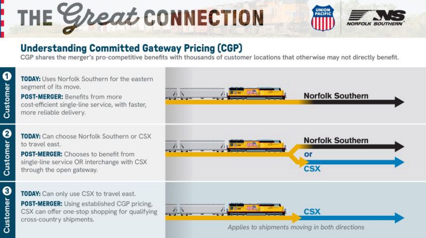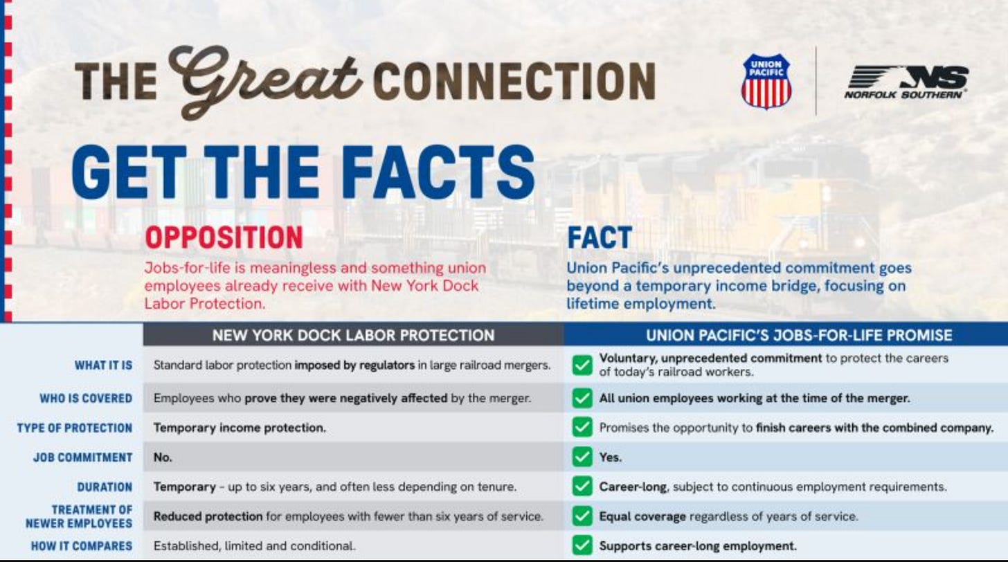 · UP, of course, persists with its own campaign extoling the virtues of its merger. Last week, marketing chief Kenny Rocker made the case at a forum hosted by the American Coal Council. Two weeks ago, Vena spoke to members of TEGMA (the Transportation, Elevator & Grain Merchants Association). The railroad maintains an active pro-merger social media campaign as well, posting—for example—about its “committed gateway pricing” and “jobs-for-life” pledges.