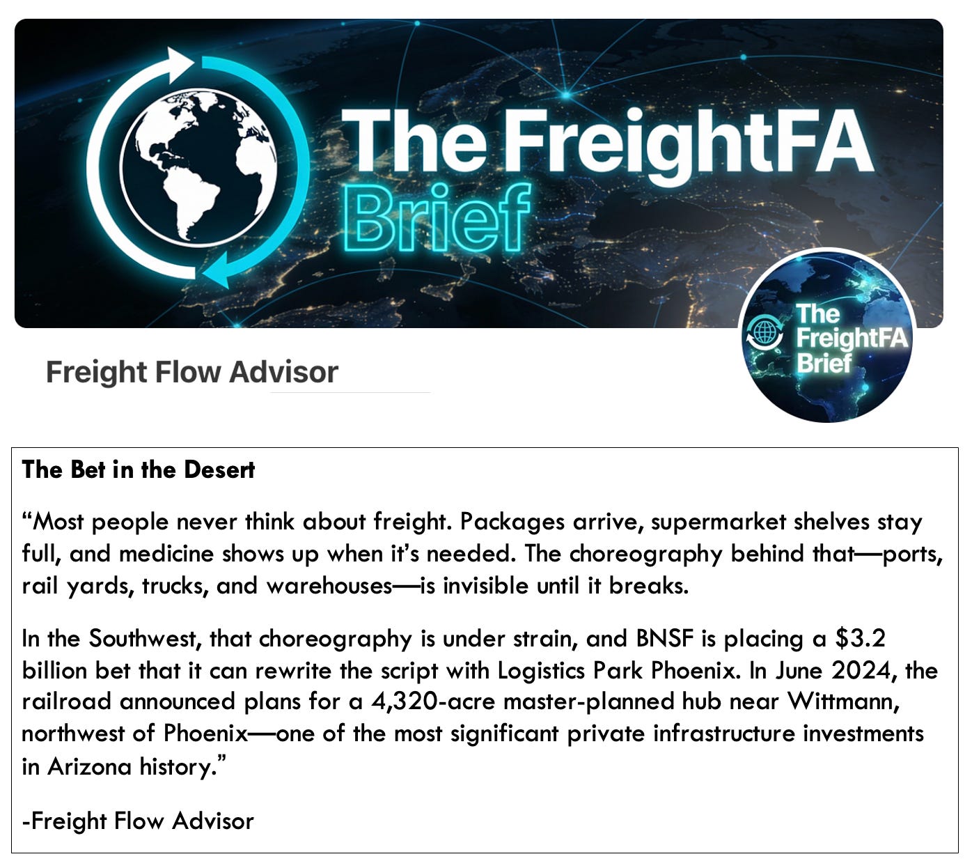 · BNSF loves talking about its giant rail hub project in Barstow, California. But don’t overlook the major investment it’s making in Phoenix. The Freight Flow Advisor digs deep into the strategy, centered on a $3.2b logistics park. It will have the capacity to handle about 220k containers by 2028 and more than 500k by 2050, helping to ease projected congestion at west coast ports. The idea: move containers arriving at California’s ports inland, to hubs like Barstow and Phoenix, for unloading and handling there rather than at the congested port. The Phoenix hub is also, importantly, designed to capitalize on growing freight volumes from Mexico as companies nearshore production. Local freight is growing too, with Phoenix currently one of the fastest-growing metros in the country. Firms like Intel and Taiwan’s TSMC are building multi-billion-dollar semiconductor plants in the area. Data centers are rising from the desert. And the population is growing. One challenge though, is that local residents have fought the project, concerned about issues like road traffic and water resources. As the article explains, BNSF’s Phoenix investment gives “a preview of how inland hubs, nearshoring, and local politics will reshape network strategy over the next 10–20 years.” For large importers and manufacturers, it adds, Logistics Park Phoenix will mean “a structural change in how they can design their networks.”