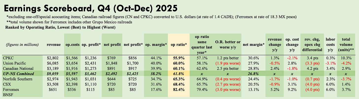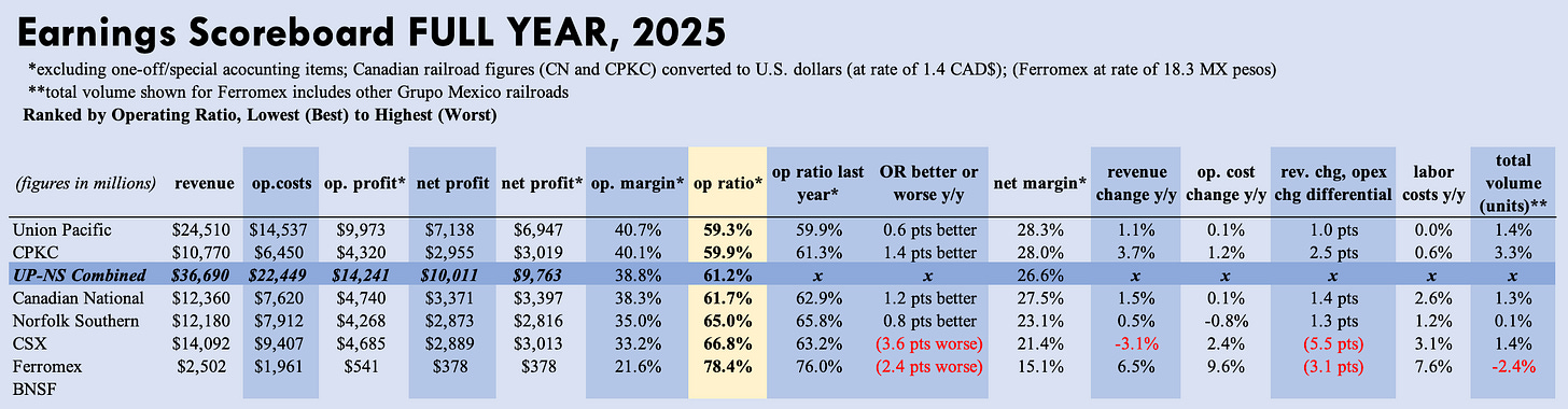 · Union Pacific, Norfolk Southern, and CSX all published their 2025 annual reports, each more than 100 pages long. UP’s report has a section advising investors of key risks associated with its Norfolk Southern takeover attempt, i.e., the possibility of having to pay NS a hefty $2.5b fee—under certain conditions—if the merger doesn’t happen. The STB, remember, is asking UP to disclose more details about these breakup conditions. At some point soon, UP will re-file its application with the additional information the STB is requiring. UP separately warned that even if approved, “the terms and conditions of the approvals… may impose requirements, concessions, limitations, or costs or place restrictions on the conduct of the combined company’s business.” You can read more about the merger risks UP raises on page 15 of the report. The Norfolk Southern report contains similar language.